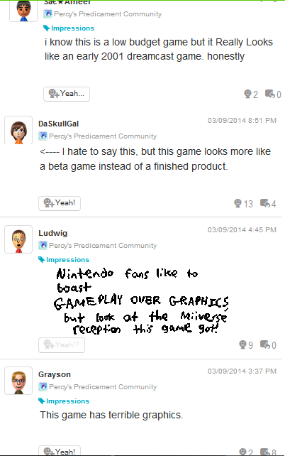 Percy's Predicament is Maestro's first videogame ever, and it's only on the Wii U. In other words, it's that Nintendo indie support effort. The same kind Two Tribes tried to give before their demise. Unfortunately, the game is absolutely getting trashed on Miiverse. Why? Well, even though Maestro has a commitment to art, their first game ever doesn't visually look the "highest quality". That's perfectly explainable. And it should mesh well with supposed Nintendo gamer values, right?