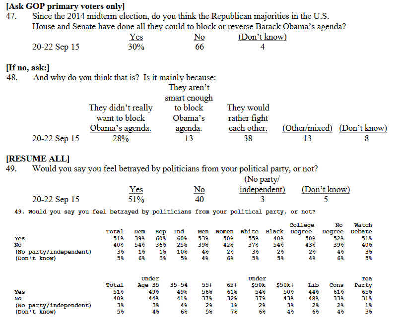 | 66% of Republican voters think the Republican Congress isn't doing its job, and 60% feel betrayed. I'm in those majorities. |
