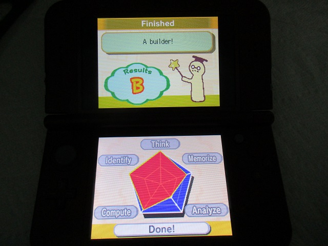 Take Brain Age and replace Dr. Kawashima's creepy polygonal head with a whimsical environment and fun touch screen games and you get Big Brain Academy. It doesn't focus on the age of your brain, but how much your brain apparently weighs. And it also focuses on aspects of the brain and how much your brain is focused on them. I haven't played the game in many years, and here was how my brain looked when I last played it... probably a decade ago?