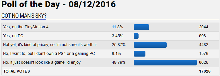 | No Man's Sky easily won a third of GameFAQs voters' hearts, which is impressive in a poll with ten games. Comparably impressive with Donald Trump's primary run. If it wasn't still hyped, it would've easily fallen to sub-Metroid Prime: Federation Force levels. |