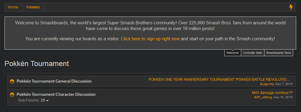 Meanwhile, back when Pokkén Tournament first came out, it also had the full support of the Super Smash Bros. community, to the point where Smashboards made a whole sub-section dedicated to Pokkén Tournament. It's, uh, been abandoned at this point.